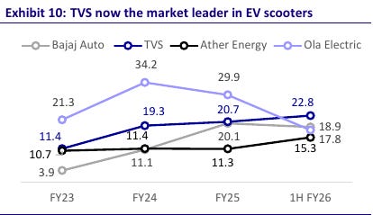 TVS Motor recently became the market leader in this segment, and last quarter, it furthered its lead. This was its best-ever quarter of EV sales, and its best quarter as a whole — with a record quarterly operating revenue of ₹11,095 crore, which translated into a profit-before-tax of ₹1,226 crore. Across categories, it sold ~15 lakh vehicles in the last quarter, of which 80,000 — roughly 5.3% — were EV scooters. Think about what that means: 5% of their business this quarter surpassed the quarterly volumes of Ola and Ather each.
