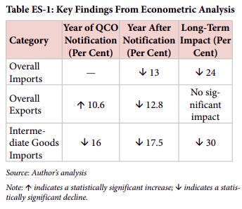 Does this work? Well, only partially. The think-tank CSEP finds that imports decline by 24% in the long term after a QCO is imposed, and the decline is even higher for intermediate goods. When it comes to suppressing imports, QCOs clearly work.