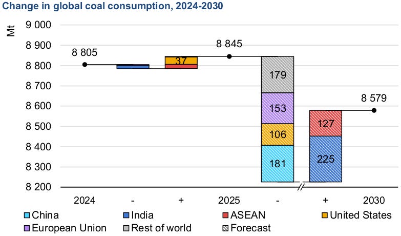 One year hence, coal’s prospects seem dim. While 2025 set another record — with the world consuming 8,845 million tons (Mt) of coal — this might be as high as it gets. If the International Energy Agency (IEA) is to be believed, global demand will fall slowly for the rest of this decade. By 2030, it will have dropped by 3% a year, to 8,579 Mt.