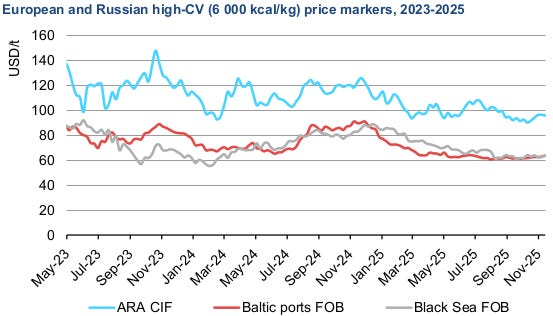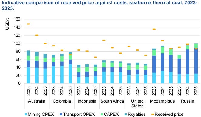 In 2025, the whiplash hit. Margins collapsed. In Europe, coal was selling at roughly ~10% cheaper than last year. In Asia, it was ~20% cheaper. Just last year, major coal exporters expected to earn roughly $20 for each ton they sold. This year, that fell to $5.
