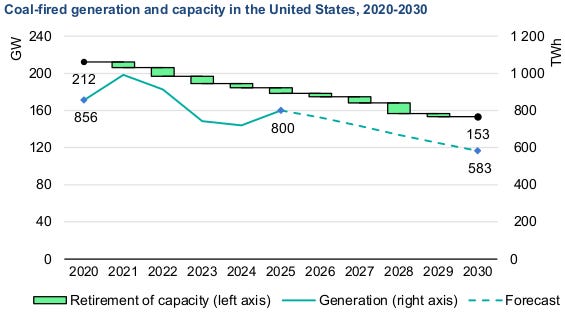 The IEA believes that the world is headed to a natural gas glut. By 2030, it expects the world to add an extra ~300 bcm of LNG liquefaction capacity. Unless demand surges as well for some unexpected reason, natural gas prices are likely to crash — at a pace that coal simply cannot match. If that happens, it could kill coal demand in a way we haven’t seen before. There will simply be no economic case for new coal plants — even as a “transitional” energy source.