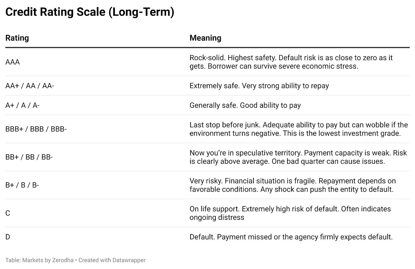 Based on that, they assign a rating. These range from the highest grade, AAA (indicating extremely low risk of default) down through AA, A, BBB (the cutoff for “investment grade”), and downwards — all the way to D (default).