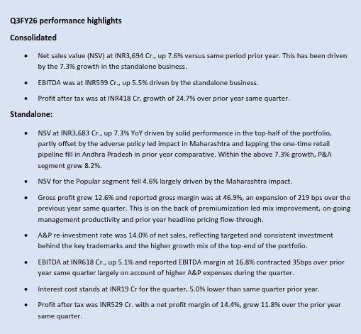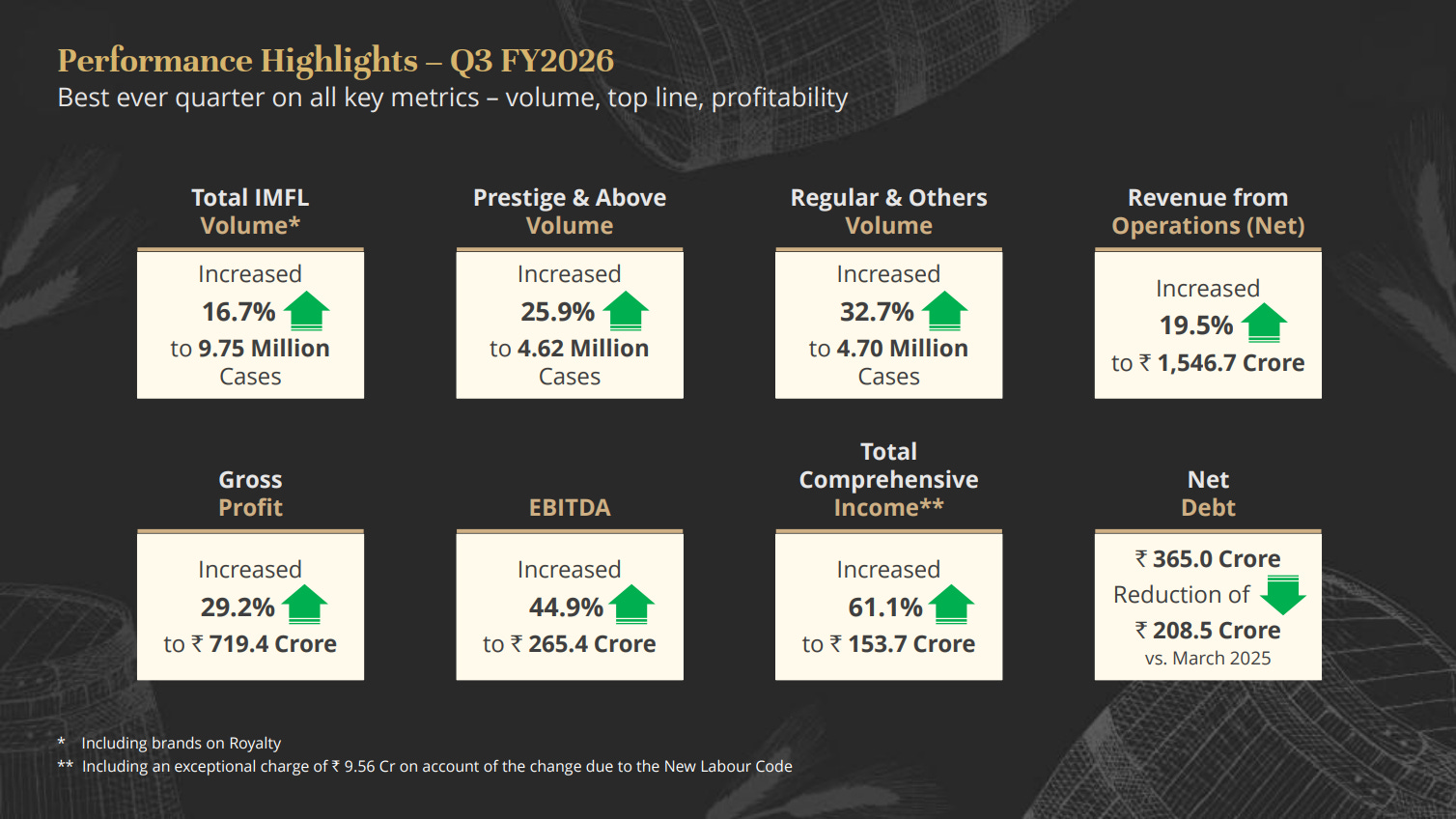 United Spirits (USL), the behemoth of the three, posted a net sales value — or revenue excluding excise duty — of ₹3,694 crore in Q3 FY26, up 7.6% year-on-year. Sequentially, that’s a 16% jump from Q2’s ₹3,173 crore — but that’s largely seasonal, given Q3 is the festive quarter.