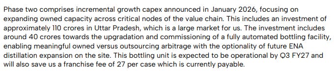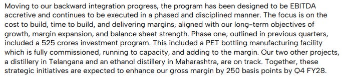 This quarter, ABD has been extremely aggressive with backward integration. It commissioned a PET bottle manufacturing facility that’s already adding to EBITDA. It is also investing in ethanol distilleries in Telangana and Maharashtra. ABD expects these decisions to improve gross margins by 2.5 percentage points by the end of FY28.
