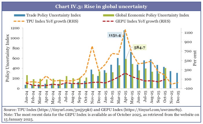 The overwhelming context, for this year’s economic survey, is the deep uncertainty in which India functions. The assumptions which shaped global trade for decades have broken down. As the survey noted, since April 2025, trade policy uncertainty has jumped twelve-fold year-on-year. The broader economic policy uncertainty index — which tracks everything from sanctions to industrial subsidies — rose 228%.