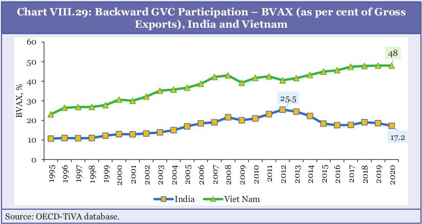 This is what other manufacturing-heavy economies have done. 48% of the value in Vietnam’s exports, for instance, come from abroad. India’s foreign share, meanwhile, is at 17.2%. But that approach has allowed Vietnam’s manufacturing industry to add more total value in their country than we do.