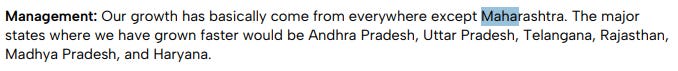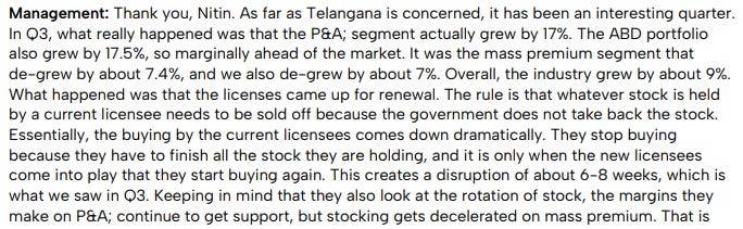 The impact of this in Q3 was painful for all the companies. It’s partly why, across the board, the volumes of all popular brands declined. When Maharashtra was excluded, growth for all companies looked much healthier.
