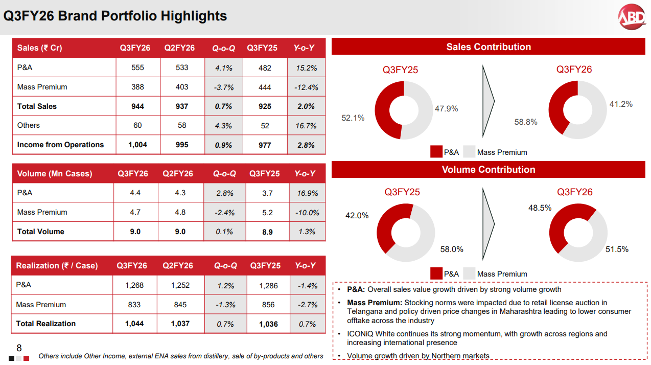 Now, the premium segment makes up 59% of ABD’s sales — a much lower ratio compared to its peers. They’ve been much slower in making the shift to premium and luxury. In fact, until Q3 FY25, their lower mass premium segment dominated the P&A category in both sales value and volume.