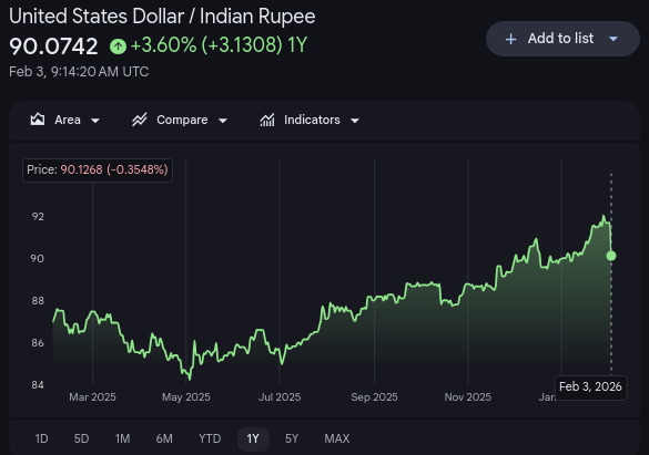 If our exports are hit, that automatically brings currency pressures. India is growing rapidly, which pushes it to import goods at an accelerating pace. When exports suddenly drop, that can rapidly open up a balance of payments deficit. This is perhaps what caused the Rupee to drop 6.5% in value between April 2025 and January 2026. Such a drop, in turn, can push foreign capital out — making it harder to fund the gap.