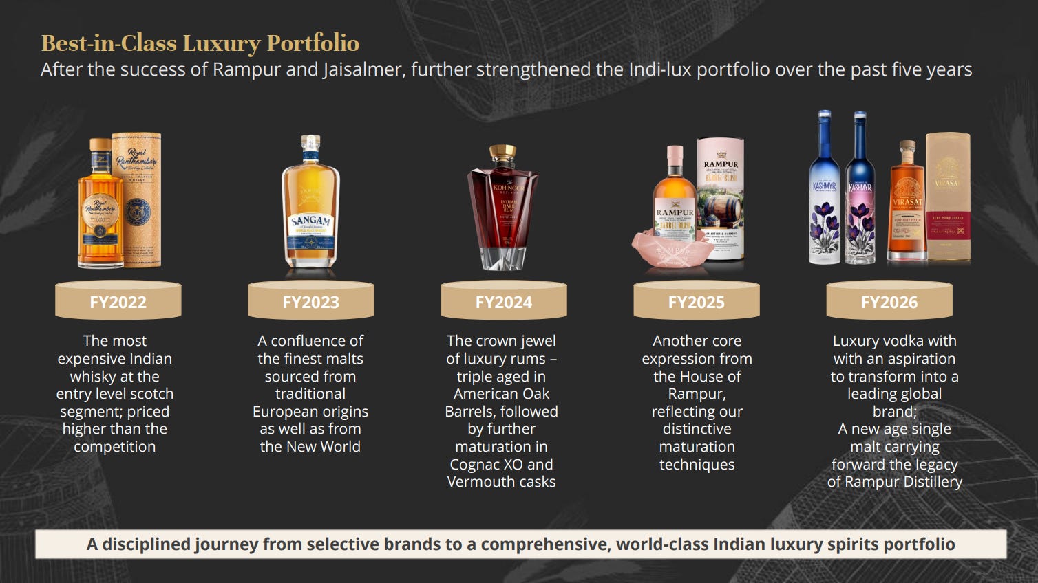Radico’s portfolio of premium drinks mostly involves whisky, which is India’s favorite poison of choice by far. However, they’ve also tapped into niches like gin and vodka. For instance, as per management, their Jaisalmer brand of gin occupies over half the luxury gin market in India. In the 9 months so far in FY26, Magic Moments, their landmark vodka brand, has nearly touched what it sold in FY25.