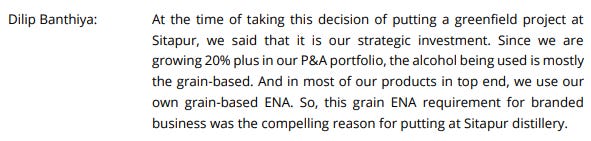 United Spirits, however, is a bit of an outlier in this context. It doesn’t own many ENA distilleries the way Radico or ABD does. It doesn’t even produce raw materials like ethanol or molasses at scale itself. However, that doesn’t imply a lack of supply chain security. It just chooses to pursue this goal differently.