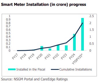 However, the project is still far behind targets. By mid-2025, a total of ~2.5 crore smart meters had been installed, which is only ~10% of the target. That said, contracts for ~12 crore meters have already been awarded — meaning that the large order books of companies are yet to be executed.