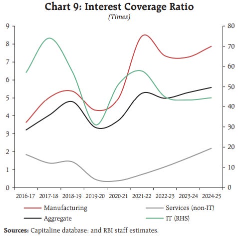As companies’ profitability recovered, they’ve made a serious attempt at improving their interest coverage ratios. Manufacturing companies, for instance, improved their ICR from around 4 times, pre-COVID, to 7.7 times post-pandemic. That is, they can now pay their interest bills nearly eight times over from what they earn. Non-IT services were the worst hit during the pandemic, dropping under the red line of 1. But as soon as cash flows improved, they brought their ICRs above 1.
