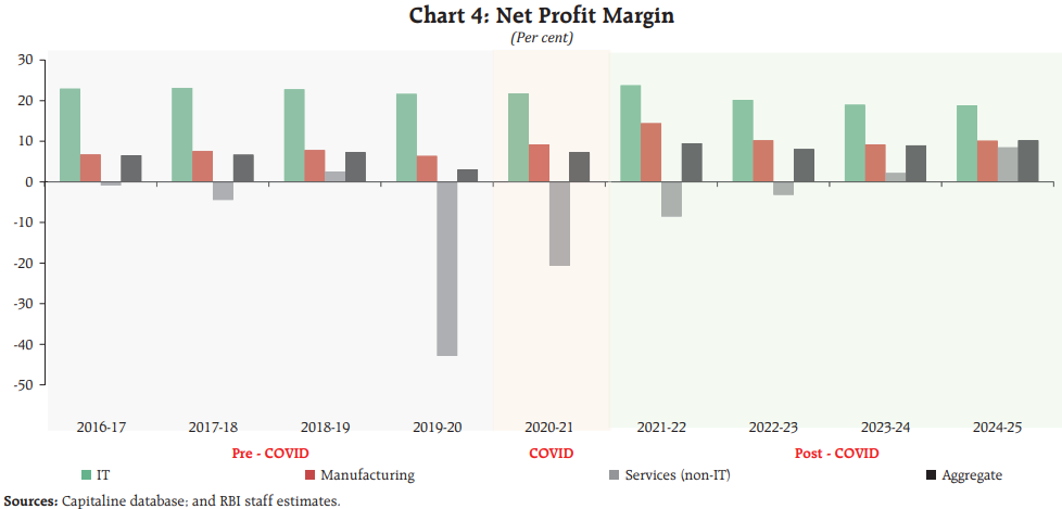 Some industries would take exceptionally long to recover. Consider non-IT services. Many of these would have to be delivered in person — and over repeated waves of COVID, struggled to turn a profit for years. IT services, too, saw a peculiar trajectory. While they did well during the pandemic, since then, activity has come down, dragging down margins with it.