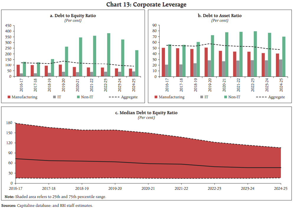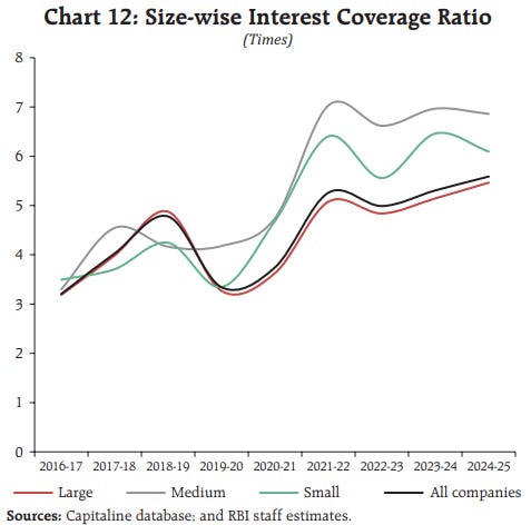 The debt-equity ratios of corporate India, too, have improved drastically across the board. For large companies, these plunged from 139.2% in FY 2020 to 94.0% by FY 2025. But once again, smaller companies achieved even more dramatic improvements, with their debt-equity ratios almost halving from 115.2% to 66.1%.
