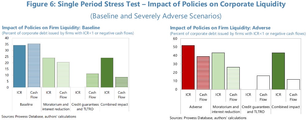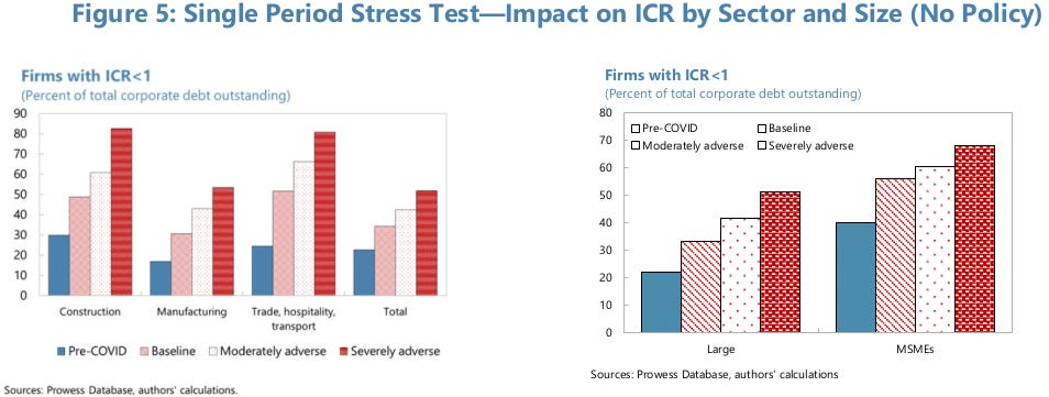 In November 2021, the IMF studied India’s economy to understand just how bad things looked. Looking at over 20,000 firms, it found that before the pandemic began, over a quarter of Indian firms were already struggling with their debt loads, with an ICR under 1. But COVID could have made things much, much worse. In its baseline, over 36% of Indian firms would be at risk. In a worst case scenario, over half of India’s firms would have found themselves in distress.