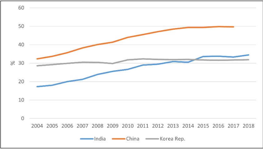 But even then, what does this decline in manufacturing even mean? Both China and Japan have soared in GDP per capita compared to India. Their services output could be more valuable in absolute terms.