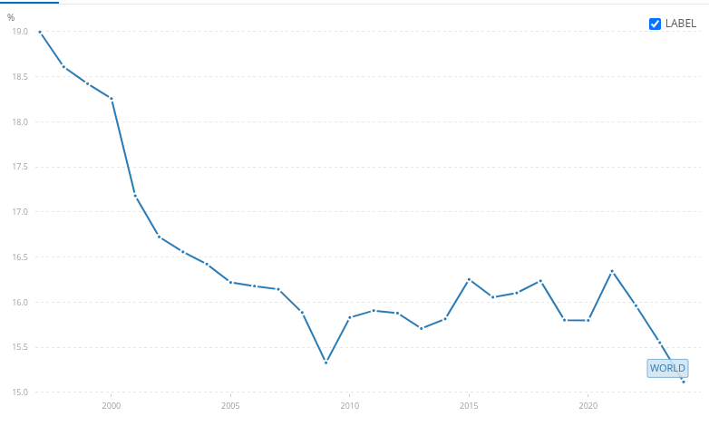 Well, manufacturing has declined across the world. It fell from 19% in 1997 to 15% last year. Much of the world seems to be de-industrializing a little too early.