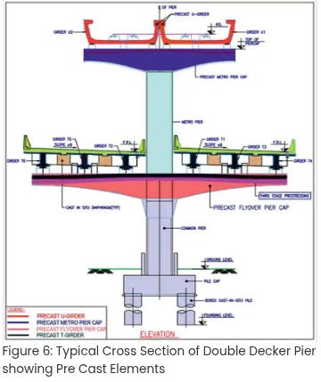 Even for an elevated metro that runs on concrete pillars above a road, you need to sink pile foundations into the earth at regular intervals along the entire route. These are large concrete columns drilled 25-30 meters deep that will eventually hold up the pillars. These pillars, in turn, hold up the viaduct which the trains run on.