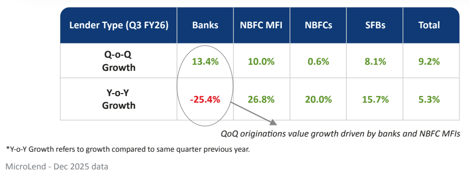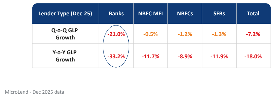 Not that everyone’s back. Banks are still pulling back hard. Their gross microfinance book fell by a stunning 21% quarter-on-quarter. The same universal banks that chased MFI yields in good years are now cutting exposure as fast as they can.