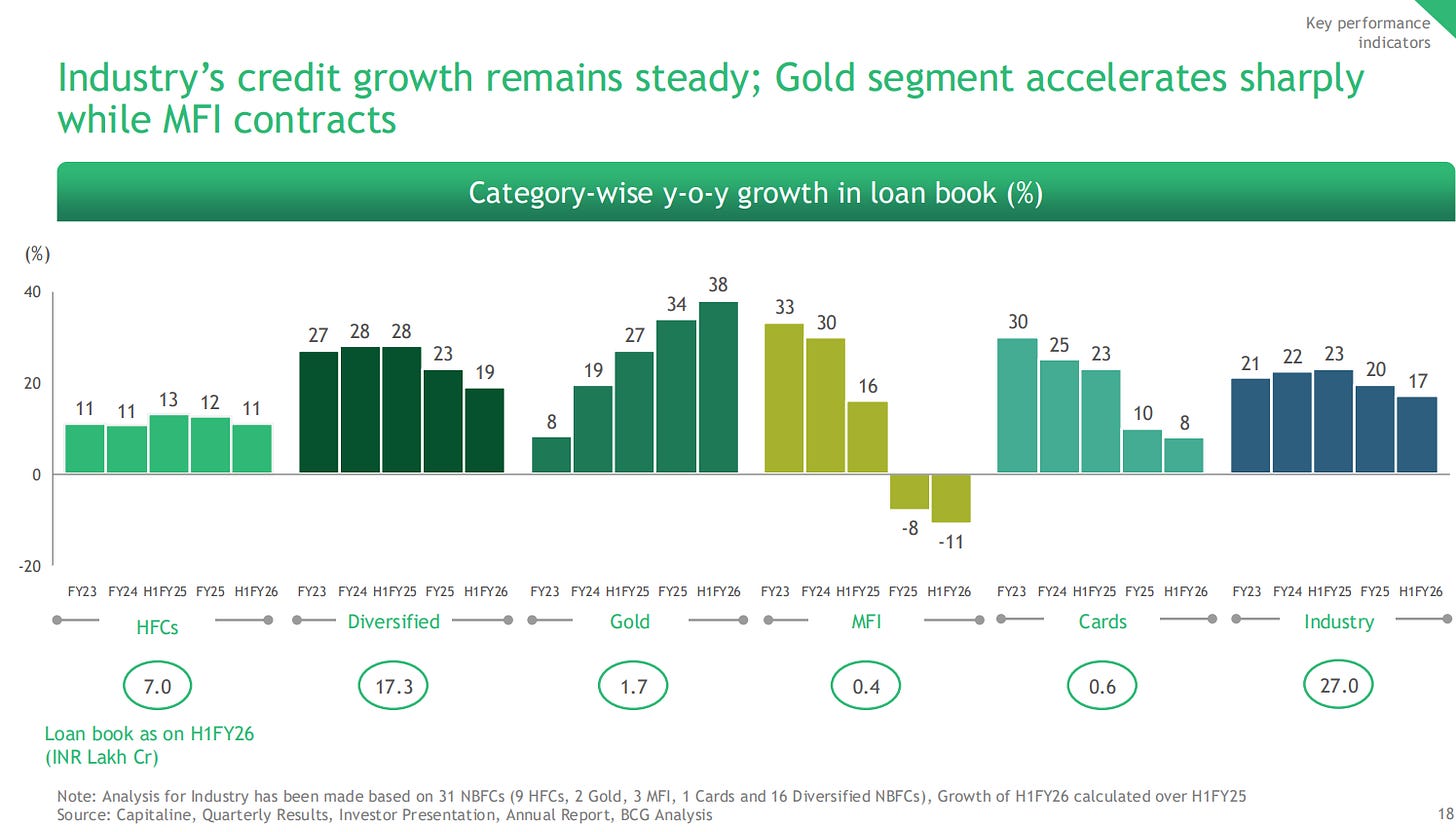 Manappuram, burned by its MFI subsidiary Asirvad posting a ₹156 crore loss, pivoted hard back to gold. And in a single quarter, their gold book grew 23%.