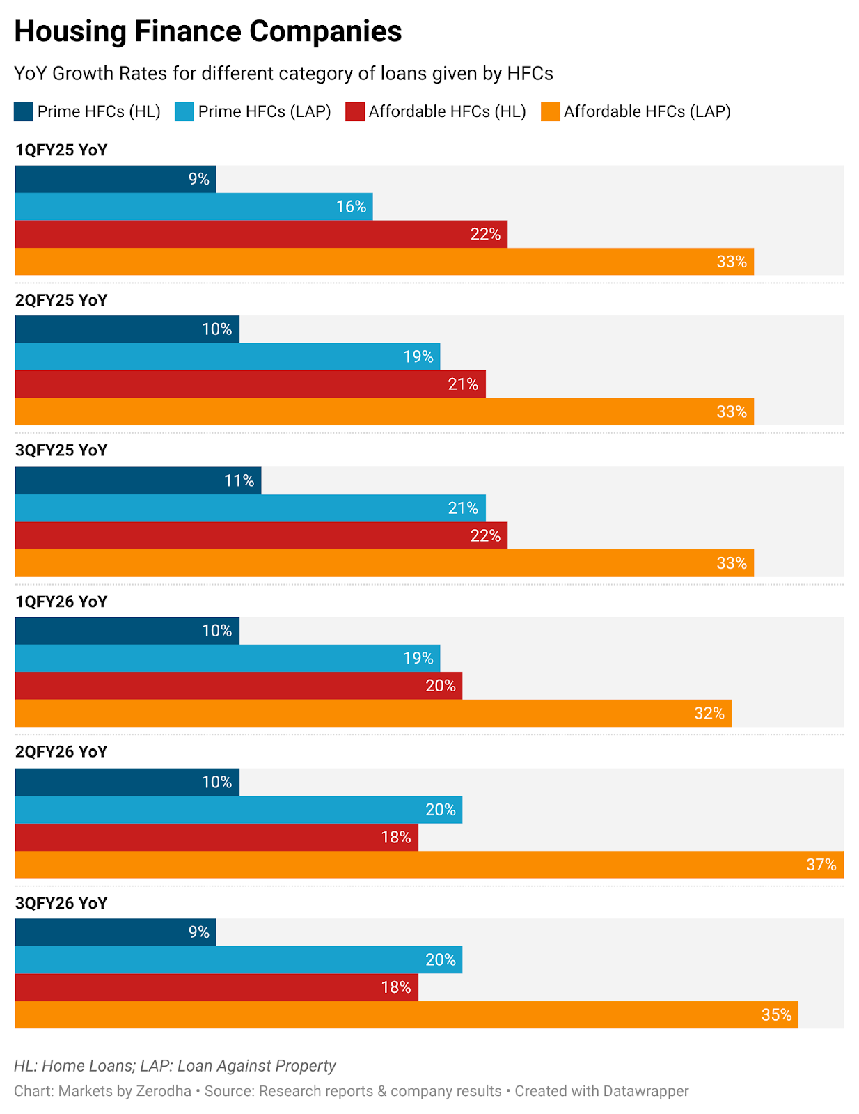You see something similar in affordable HFCs, which give loans under ₹20–30 lakh. Their home loans grew 18%, but LAP jumped by twice that — 35%.