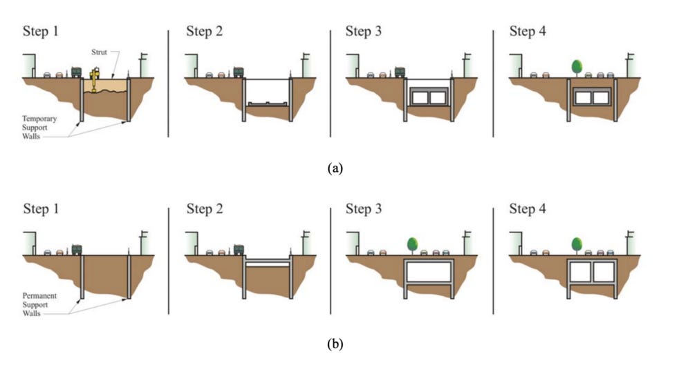 For underground stations, you excavate a large pit from the surface, build the station inside it, and restore the road above. This process is called cut-and-cover.