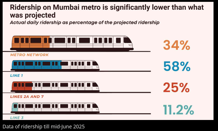 Mumbai’s story is more concerning. The Aqua Line, the city’s first underground metro, which cost roughly ₹14,000 crore to build, averages fewer than 20,000 daily passengers, against a projection of 4 lakh. Across all four of Mumbai’s operational metro lines, total daily ridership is under 7 lakh, against an aggregate projection of nearly 19 lakh. The city is spending over ₹90,000 crore building its metro network, but only getting a fraction of the usage those numbers were built around.