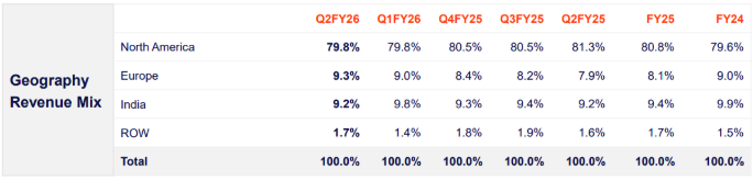 Persistent derives 79% of its revenue from North America, owing to most of the best tech firms being located there. Large-caps, by contrast, have far more diversified geographic exposure—TCS earns nearly 50% from North America.