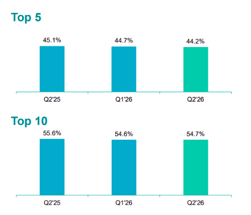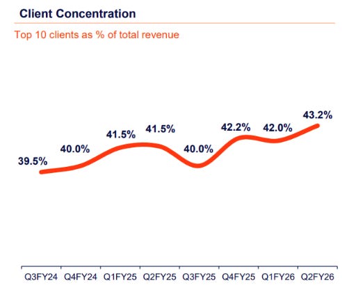The client concentration is even starker. Persistent’s top 10 clients account for over 40% of revenue — meaning that losing even one major account is a significant blow. For Tata Elxsi, that ratio is a whopping ~55%.