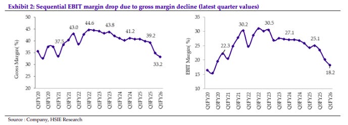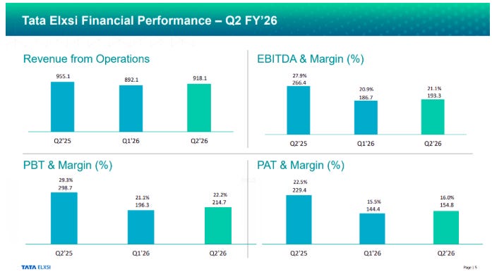 Tata Elxsi had a more sobering second quarter. Revenue grew by ~3% this quarter to ₹918 crores, but it is actually ~4% down from what it was last year. The operating margin this quarter is 21%, while the PAT margin is at 16%.