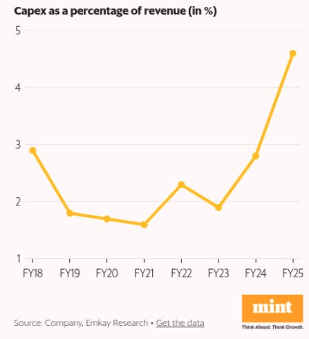 Coforge is also playing the AI game in its own way. In an industry that is known to be asset-light that spends barely 2-3% of their revenues on capex, Coforge has doubled their capex share. And much of it is being devoted to building their own AI platforms and IPs.