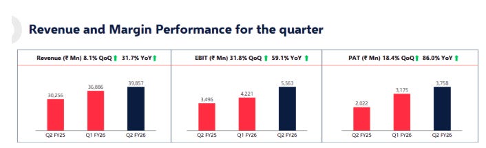 Then comes Coforge, which had an even better quarter. The company reported ~₹3,986 crore in revenue for Q2 FY26, a 32% increase from the same time last year. Their PAT for the quarter was at ~₹376 crore, which is nearly 10% of the revenue. But what is worth highlighting is that compared to last year, their PAT is close to being doubled. The major segments they play in: banking / financial services / insurance (BFSI) and travel, have all enjoyed solid growth.