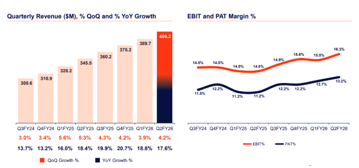 Let’s start with Persistent. They posted ~₹3,605 crore in revenue for Q2 FY26, up 17.6% year-on-year and ~4% from last quarter. Their profit-after-tax (PAT) margin was 13.2% — a whopping ~45% increase from last year. This quarter marked Persistent’s 22nd consecutive quarter of sequential growth.