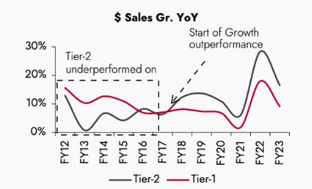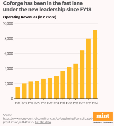Coforge’s performance is actually far more impressive when you dig into their history. A decade ago, Coforge — then NIIT Technologies — was considered a laggard. Until 2017, it grew 11% every year. But that year, NIIT’s leadership team changed almost overnight, and 3 years after that, it renamed itself. Since then, Coforge nearly doubled their annual growth rate.