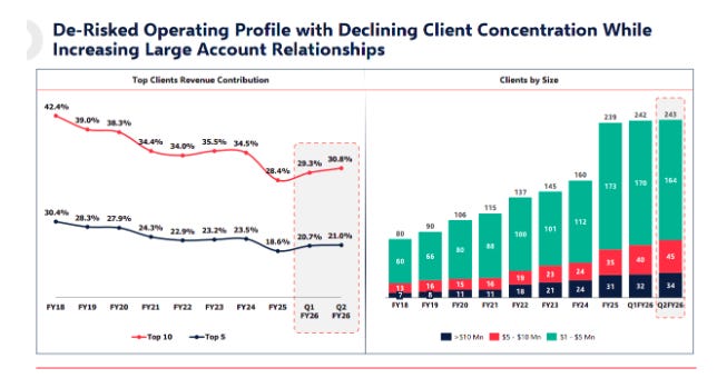 In the case of tier-1 firms, though, the top 10 clients make up just ~20% of their revenue. They wouldn’t hurt as much if they lost one of these clients. In fact, Coforge has been actively trying to reduce their top 10 client concentration.