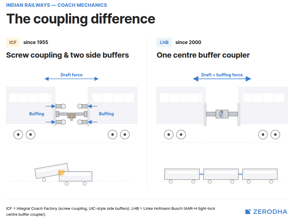 However, since these were two separate systems with gaps between them, coaches actually had room to move too loosely against each other. Which also meant that if the train stopped suddenly, say, in a collision, coaches could disconnect, slam into each other, and climb on top of one another. This is what kept happening through a series of bad derailments in 2015-16, and it forced Indian Railways to act.