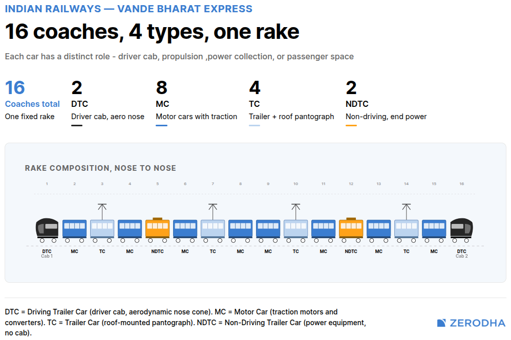 Vande Bharat works differently, though. Half of its coaches have their own motors. A standard 16-coach Vande Bharat has 8 motor coaches, with traction motors tucked under the floor. There is no need for a separate locomotive. Driver cabs sit at both ends, so the train never needs to be turned around at a terminal, either. Since the power is spread across the train instead of sitting in one engine, it accelerates much faster.
