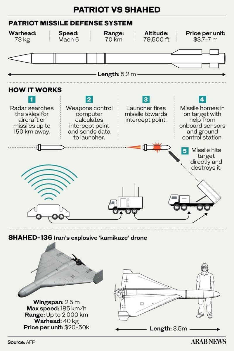 Now consider what stops it. The Patriot missile system is one of the most sophisticated weapons ever built. A single Patriot battery, the radar, launchers, control systems, costs over $1 billion (₹8,400 crore) to set up. Each interceptor it fires costs $4 million (₹34 crore) — around 114 times that of the Shahed. It costs them that much more to destroy an Iranian missile.