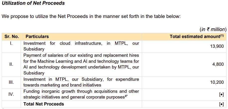 Meesho plans to raise about ~₹7,000 crore in its IPO, including a fresh issue of ₹4,250 crore. According to the DRHP, the money will primarily strengthen its tech backbone and market reach.