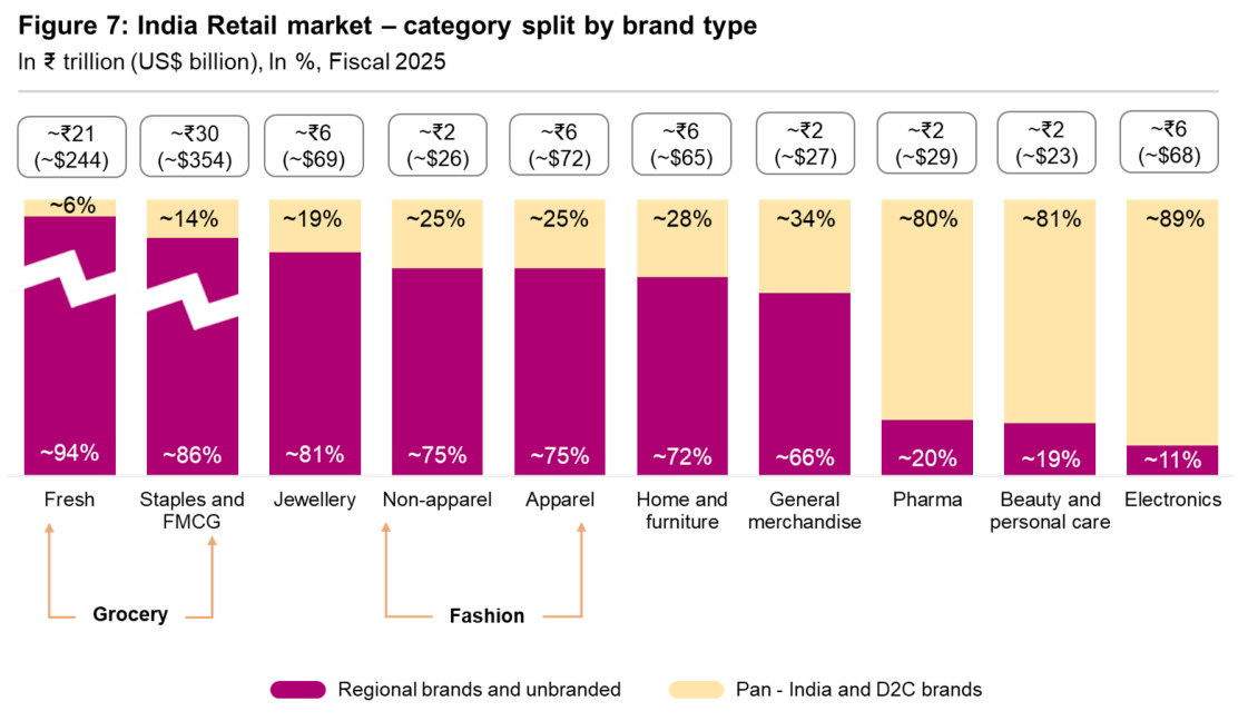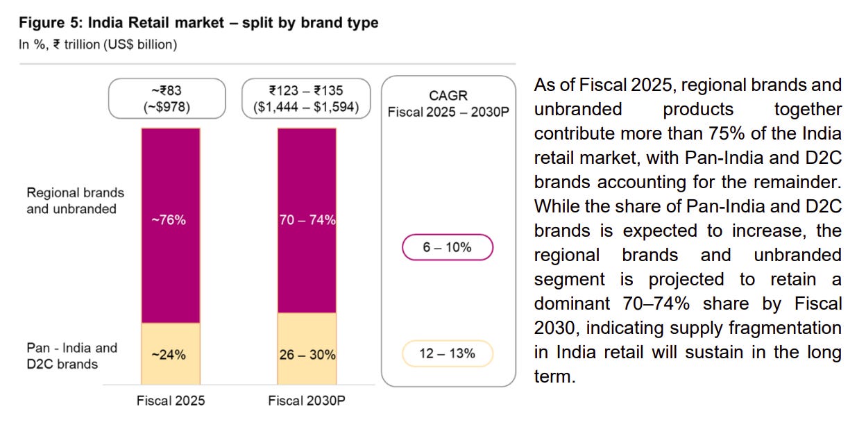 At the heart of this strategy is one realization: 75%+ of India’s retail market is unbranded or regional products, and even by FY2030 that share will be ~70%. In other words, the long tail of no-name products is the market in India, not a bug. Meesho explicitly caters to this segment.