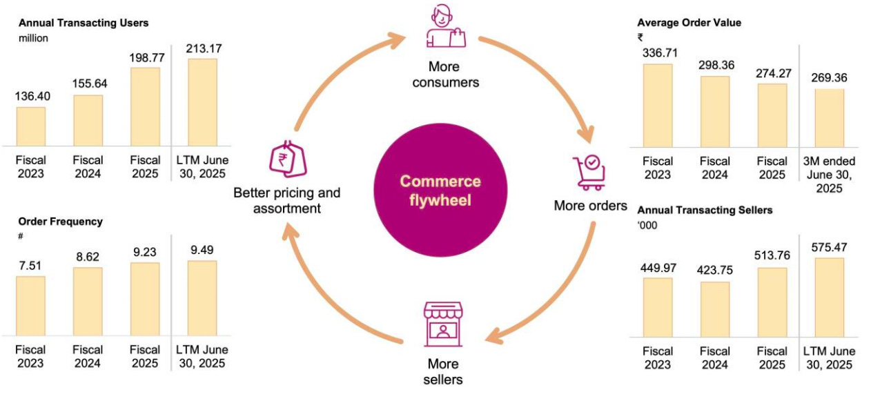 Meesho embraces falling AOV as a growth feature: lower ticket size = more people buying more often. As the company puts it, the Meesho flywheel is all about wider assortment at cheaper prices -> more customers -> attracts more sellers -> even better prices and variety. While others chase higher spending per order, Meesho is happy to “race to the bottom” on price, because that’s where the mass market in India lives.