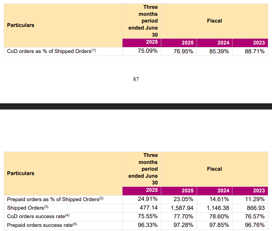 Every order on Meesho runs through its system which assigns deliveries to partner couriers. Sellers pay a shipping fee to Meesho, which is a major income source. In FY25, its in house logistics arm – Valmo – handled 62% of Meesho’s orders, lowering costs by roughly 12% compared to traditional couriers. That efficiency lets Meesho keep the cost of delivery low while still earning a margin on delivery fee it charges its sellers.