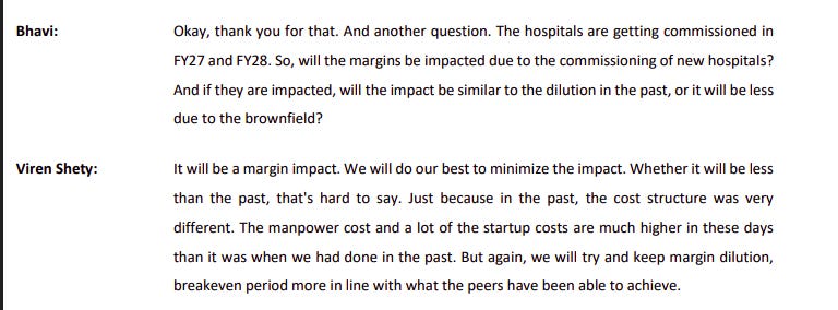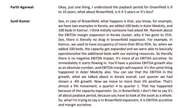 “...in Kannur. I think initially someone had asked Mr. Ramesh about the EBITDA margin expansion in Kerala cluster, why it has gone to 25%. See, there is literally no drag in brownfield expansion. For example, in Kannur, we used to have occupancy of more than 90 to 95%. So, when we added 100 beds, the capacity got expanded and we were able to basically operationalize the additional beds with our existing resources. So literally there is no negative EBITDA impact. It's more of an EBITDA accretive. So immediately it starts flowing in. You'll have a positive EBITDA growth also as an absolute number, and EBITDA margin will expand.”