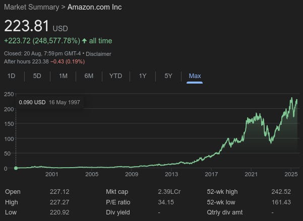 Back then, many people took the dramatic crash as proof that the internet has no use, or that e-commerce was a dumb idea. And who could blame them? A company like Amazon, for instance, fell from a share price of over $4.75 to $0.30. That is, in less than two years, it had lost ~93% of its value. It would only gain that value back years later, after the Global Financial Crisis had come and gone.