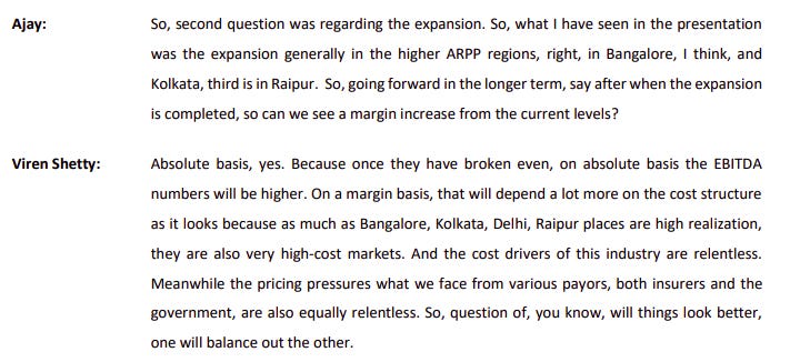 “On a margin basis, that will depend a lot more on the cost structure as it looks because as much as Bangalore, Kolkata, Delhi, Raipur places are high realization, they are also very high-cost markets. And the cost drivers of this industry are relentless. Meanwhile the pricing pressures what we face from various payors, both insurers and the government, are also equally relentless."