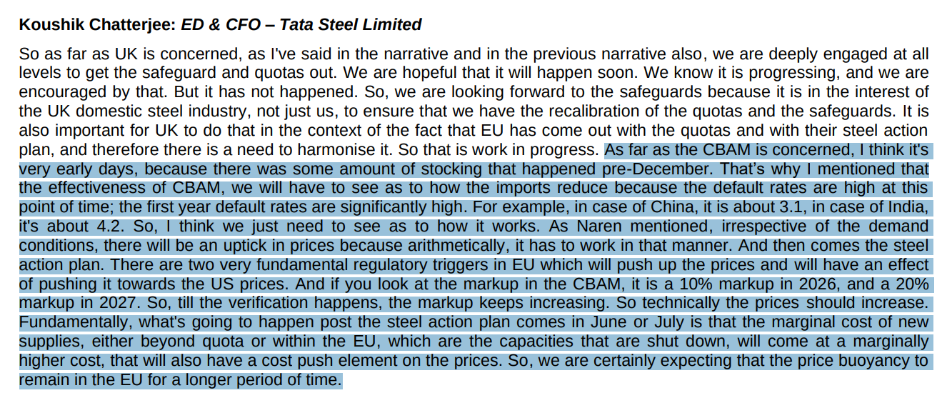 “And if you look at the markup in the CBAM, it is a 10% markup in 2026, and a 20% markup in 2027. So, till the verification happens, the markup keeps increasing. So technically the prices should increase.”