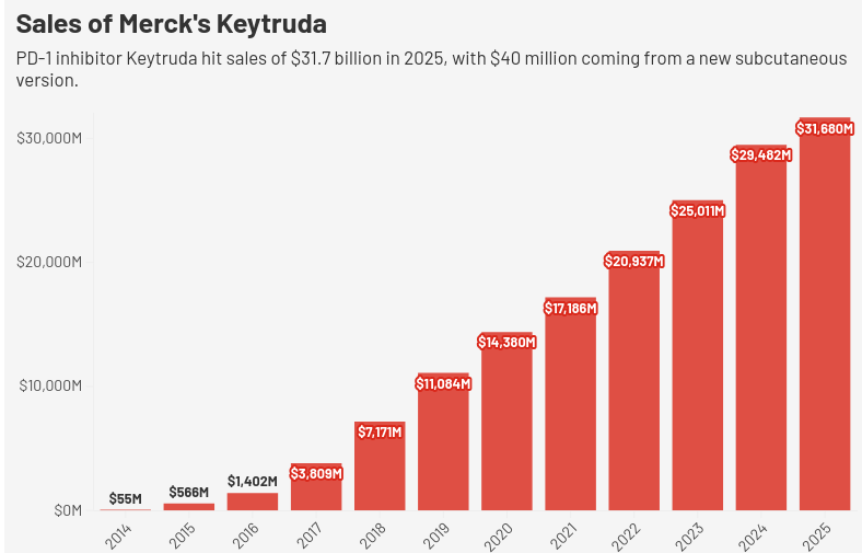 The best-selling drug in the entire world is Keytruda, or more scientifically, pembrolizumab. In 2025 — a single year — it clocked sales of over $31 billion. That puts it in a club of one: well ahead of global blockbuster drugs like Ozempic. That’s for good reason: Keytruda is the literal cure for cancer.