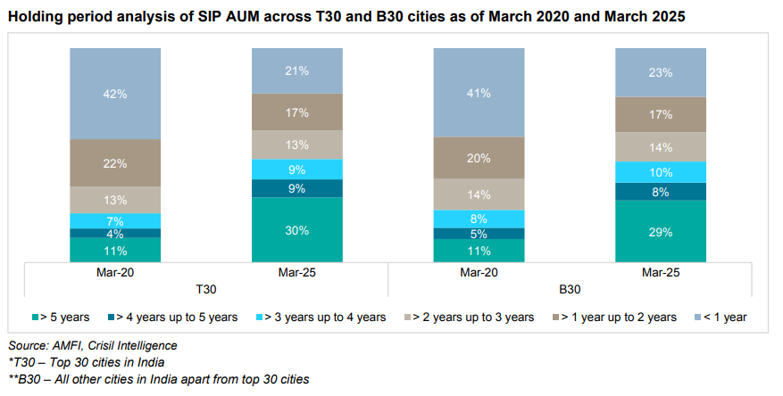 There’s also this long-term shift across geographies. Whether in the top 30 cities or smaller towns beyond them, the holding period trend is nearly identical. SIPs held for more than five years jumped from around 4–5% in 2020 to nearly 30% in 2025. Meanwhile, short-term SIPs, those held for less than a year, have dropped from over 40% to just around 21–23%.