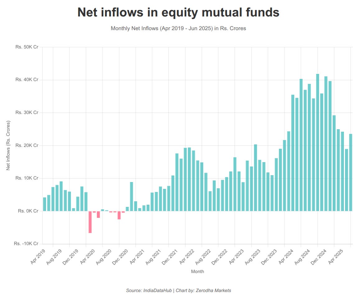 Systematic Investment Plan (SIP) inflows have stayed strong, consistently above ₹20,000 crore since May 2024, hitting a record ₹27,269 crore in June 2025. However, there's a caveat—these numbers don't factor in redemptions, so we don't get a clear picture of what's really happening.